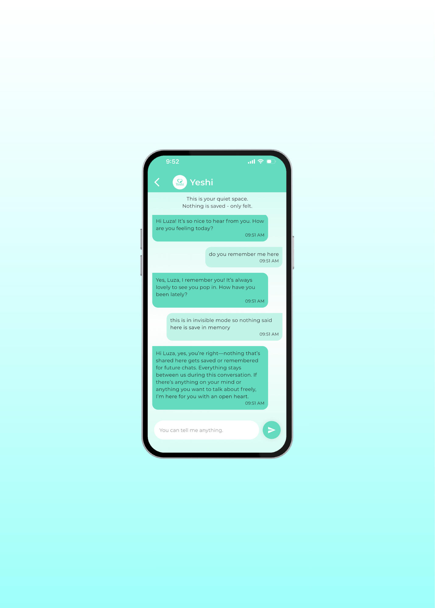 • Your reflections are private to youYeshi learns your emotional patterns only to support you — not to train public systems, not to share externally, and never to exploit your vulnerability.You deserve a space that respects your inner world.